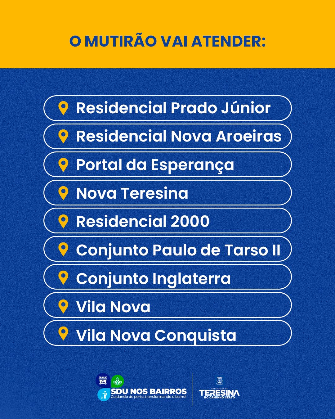 A ação contará com um grande mutirão de limpeza, mobilizando aproximadamente 800 trabalhadores, reunindo equipes de limpeza de todas as SDUs de Teresina, em uma verdadeira força-tarefa de combate ao descarte irregular de lixo e com foco nos pontos críticos na região. Os trabalhos terão início na sexta-feira (6), no sábado (7), a ação contará com a presença do prefeito Silvio Mendes, que acompanhará a saída das equipes às 7h30, na quadra poliesportiva do Residencial Vila Nova, no bairro Aroeiras. Já no domingo, os trabalhos se concentram principalmente no recolhimento do material proveniente da capina, varrição, roço e poda.